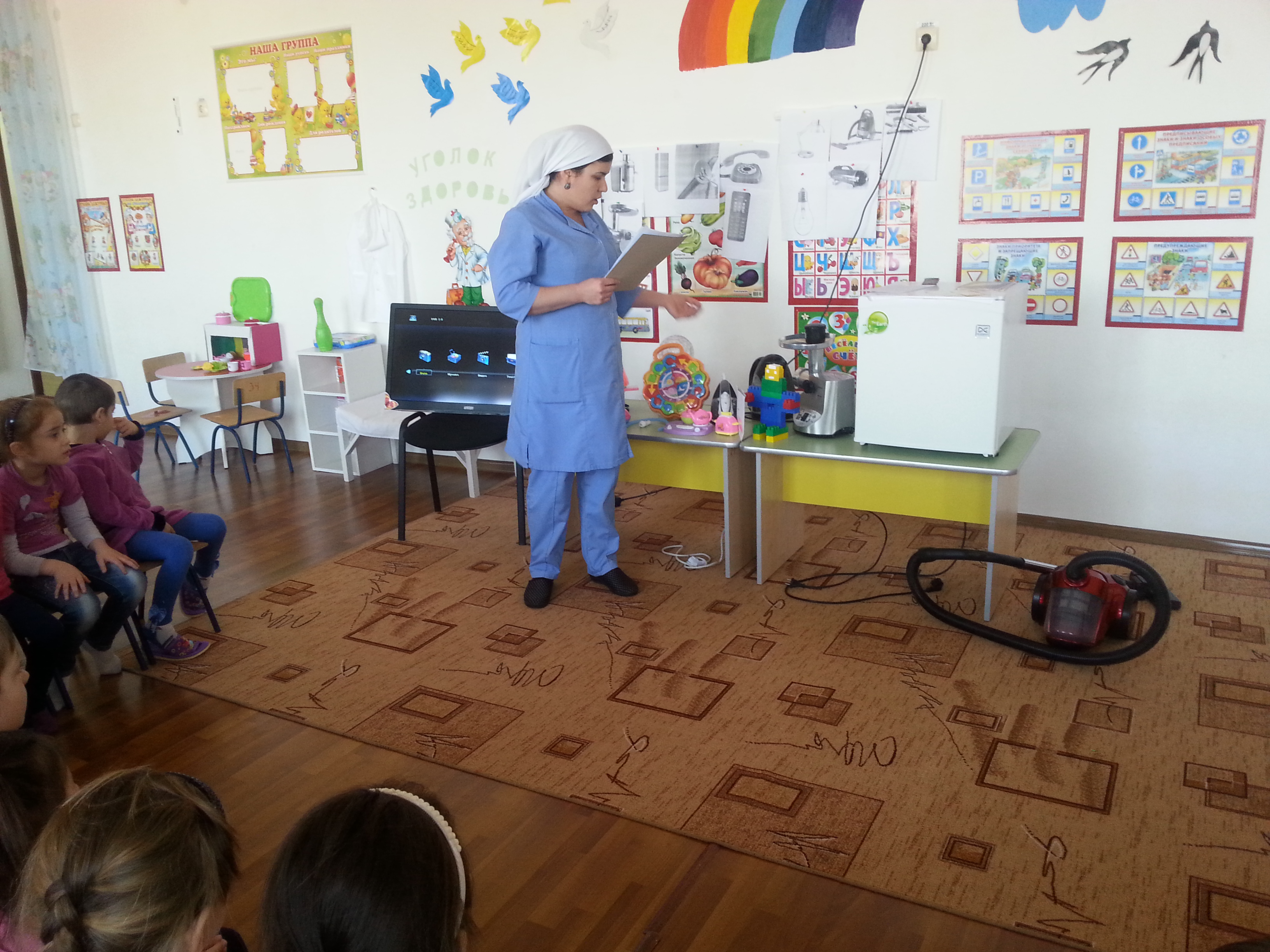 На занятии была проведена сюжетно-ролевая игра «Домохозяйка», что очень заинтересовало детей. Своей целью воспитатель Абдулкадырова С.Ш. поставила: расширение знаний о разнообразии бытовой техники, закрепление представления детей о назначении бытовых приборов и техники безопасности, изучить правила безопасного поведения в обращении с электроприборами в быту. И в заключение была показана инсценировка русской народной сказки «Крошечка-Хаврошечка».