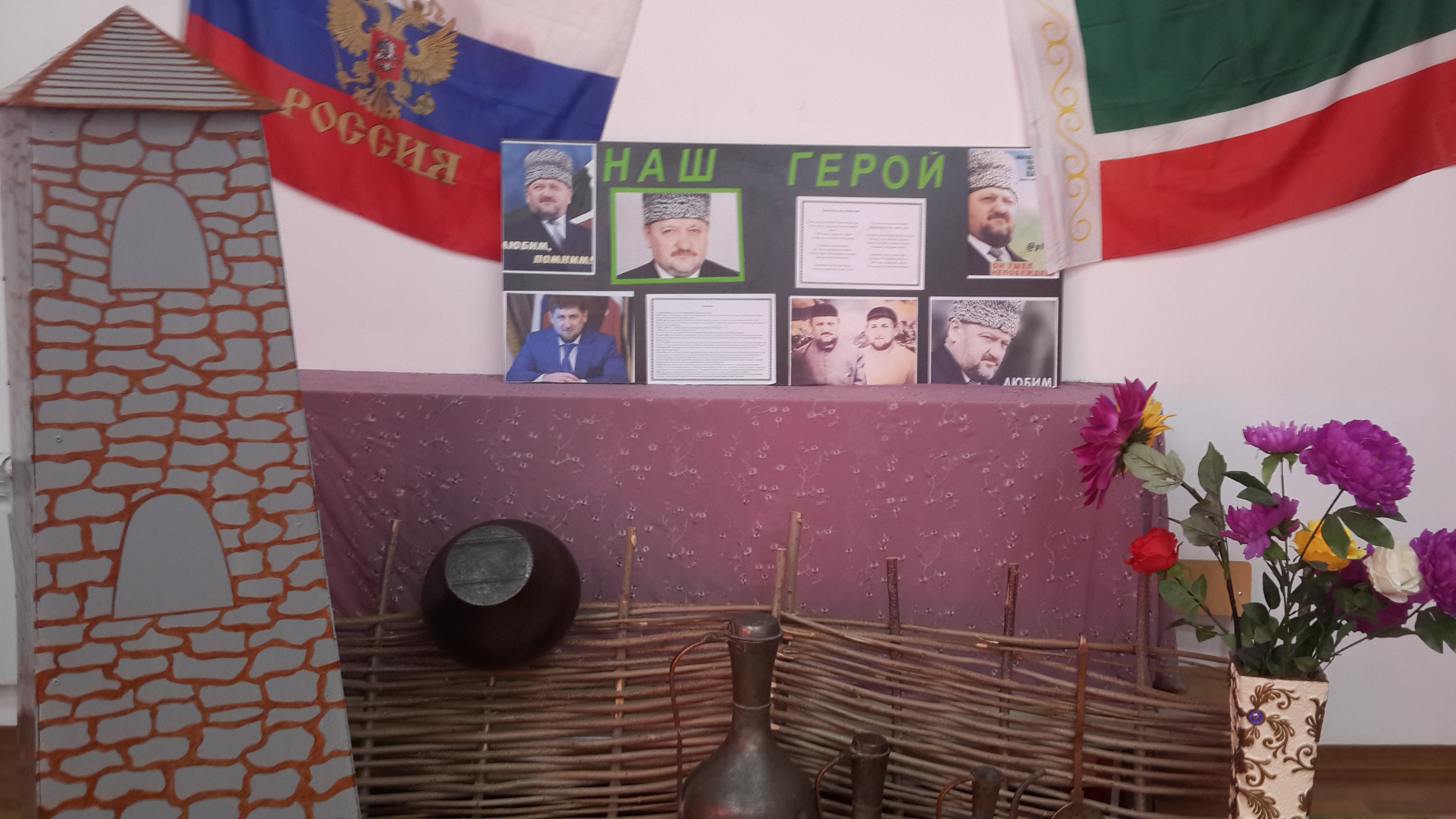 Коллективом МБДОУ «Детский сад №1 «Улыбка» была подготовлена стенгазета «Наш герой», посвященная 65-ой годовщине со Дня рождения первого Президента ЧР А.-Х.А.Кадырова. В ней собраны фотографии Президента, стихи об А.-Х.А.Кадырове, истории из его жизни.