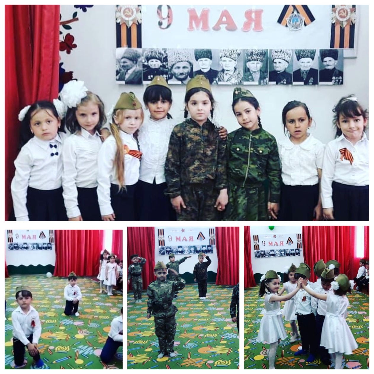 В нашем детском саду из года в год проводятся мероприятия посвященные празднованию Великой Победы, и этот год не был исключением, в этом году также состоялось мероприятие, посвященное празднованию Дня Победы. Предварительно с детьми в группах были проведены занятия по данной тематике. В группах были оформлены выставки детских работ по теме «Мы защитники своей Родины», участвовали в конкурсе детских рисунков « Мы за мир», были оформлены родительские уголки, организована выставка плакатов ко Дню победы, которые также украшали зал во время проведения праздника. Дети узнали о городах – героях, таких как Москва, Ленинград. Праздник стал итогом этих мероприятий. Оформление зала соответствовало теме патриотизма, в центре залы были вывешены фотографии солдат ВОВ, дети также ознакомились с содержанием этих фотографий. Мальчики и девочки подготовили танец «Синий платочек», танец был очень трогательным и красивым, приглашенные гости с удовольствием наблюдали за детьми.
